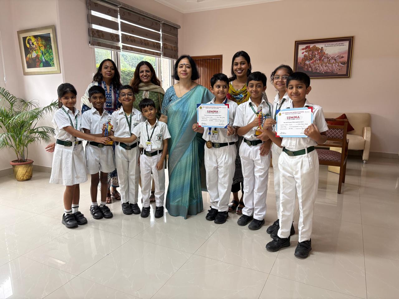 K R Mangalam World School organized a festival called Lumina on 30th August, 2025. Students from Class 3 Cambridge— Suveer Mitra, Rajvardhan Bihani, Miransh Karki, and Erisha Asija— participated in the event titled ‘Puppetry - Story with a Twist.’ In another event, titled ‘Ad Mad’ - Aadhir Gupta, Pragunn Kaur Soodan, Saatvik Gupta, and Sharanye Jain from Class 4 Cambridge took part in the event. Both the teams made the school proud by securing the First Prize in their respective events. They received special recognition for their unique ideas, excellent preparation, and impeccable performances.